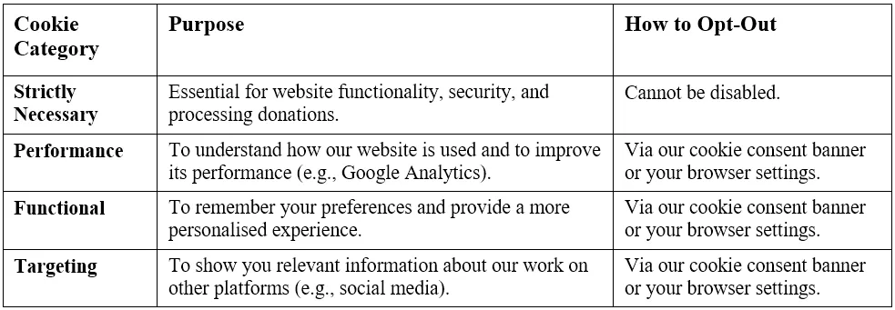 These cookies are essential for you to move around the website and use its features, such as accessing secure areas or making donations. Without these cookies, services you have asked for cannot be provided. You cannot opt out of these cookies.